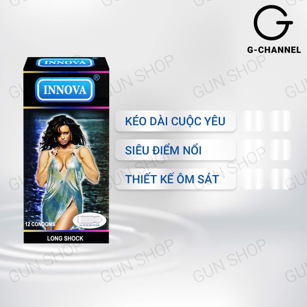 Bao cao su siêu điểm nổi Innova đen gồm những điểm gai nhỏ mềm mịn được sắp xếp dọc quanh thân bao giúp kích thích điểm mẫn cảm, massage “cô bé” của người nữ giúp bạn và người ấy cùng thăng hoa, tận hưởng tối đa khoái cảm của cuộc “yêu”